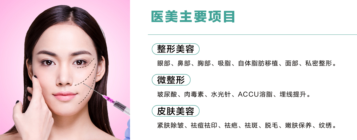 我们和韩国翰林大学医疗院战略合作,拥有国际权威整形专家,三甲医院级别手术室,开展整形美容:眼部、鼻部、胸部、吸脂、自体脂肪移植、面部、私密整形;微整形:玻尿酸、肉毒素、水光针、溶脂、线雕;皮肤美容:紧肤除皱、祛痘祛印、祛疤、祛斑、脱毛、嫩肤保养、纹绣等。