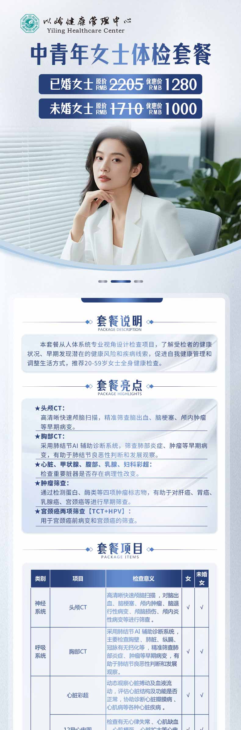 首页 > 健康体检 > 中青年女士体检套餐(1280)
