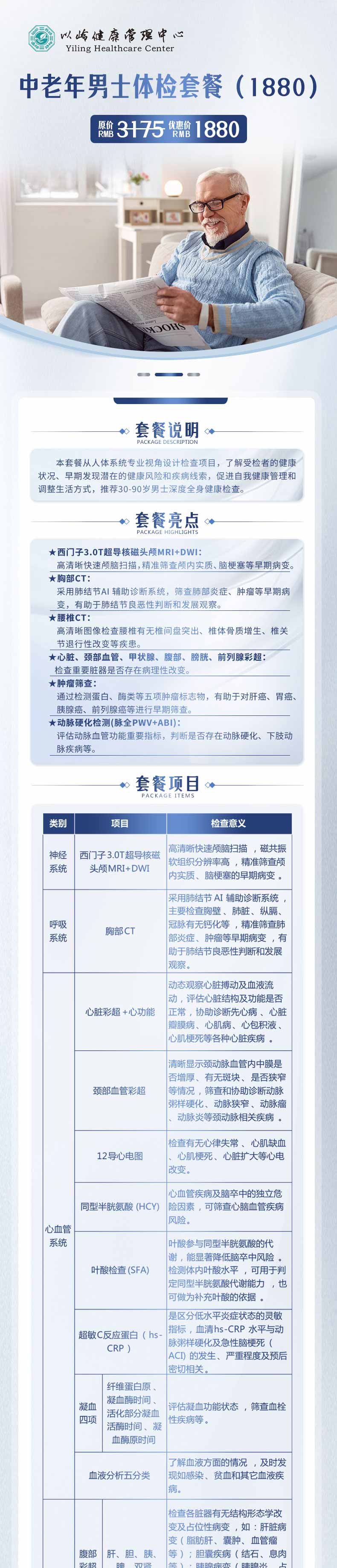 首页 > 健康体检 > 中老年男士体检套餐(1880)