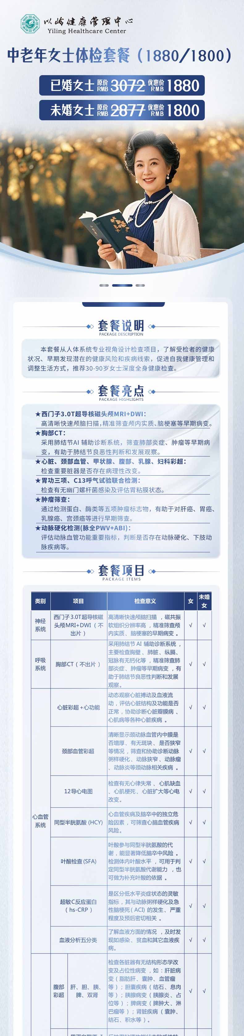 首页 > 健康体检 > 中老年女士体检套餐(1880)